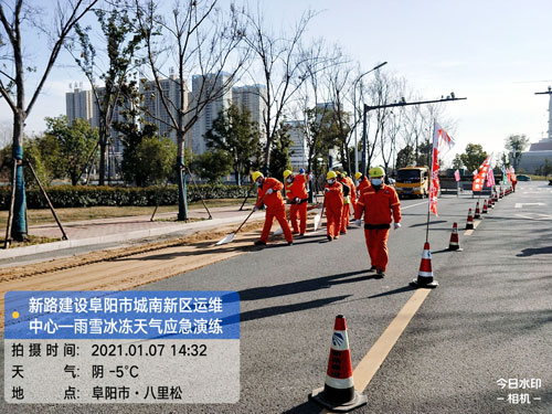 近日,阜阳市天气温度持续下降至零下8℃,雨雪天气随时到来,为了应对市政道路恶劣天气出现的雨雪冰冻灾害,保证城市交通正常运转,做到提前预防、储备充分、迅速响应等,我部联合市管桥梁项目制定了《运维事业部阜阳运维中心雨雪冰冻天气应急预案》,为确保预案安全、高效、科学、环保且行之有效,在公司安全科的指导下,于2021年1月7日下午在阜阳市城南新区清颍路与八里松路交口进行了预案演练。
