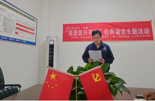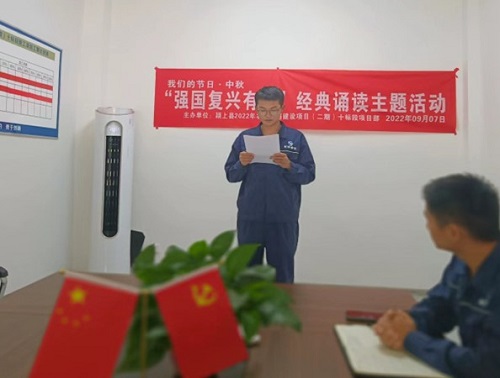 在中秋佳节即将到来之际,为大力弘扬中华优秀传统文化,积极培育和践行社会主义核心价值观,丰富广大员工的生活,迎接中秋佳节,9月7日中午,颍上县2022年农村公路建设项目(二期)十标段项目部特举办以“强国复兴有我”为主题的经典诵读活动。本次活动在项目部会议室举行。