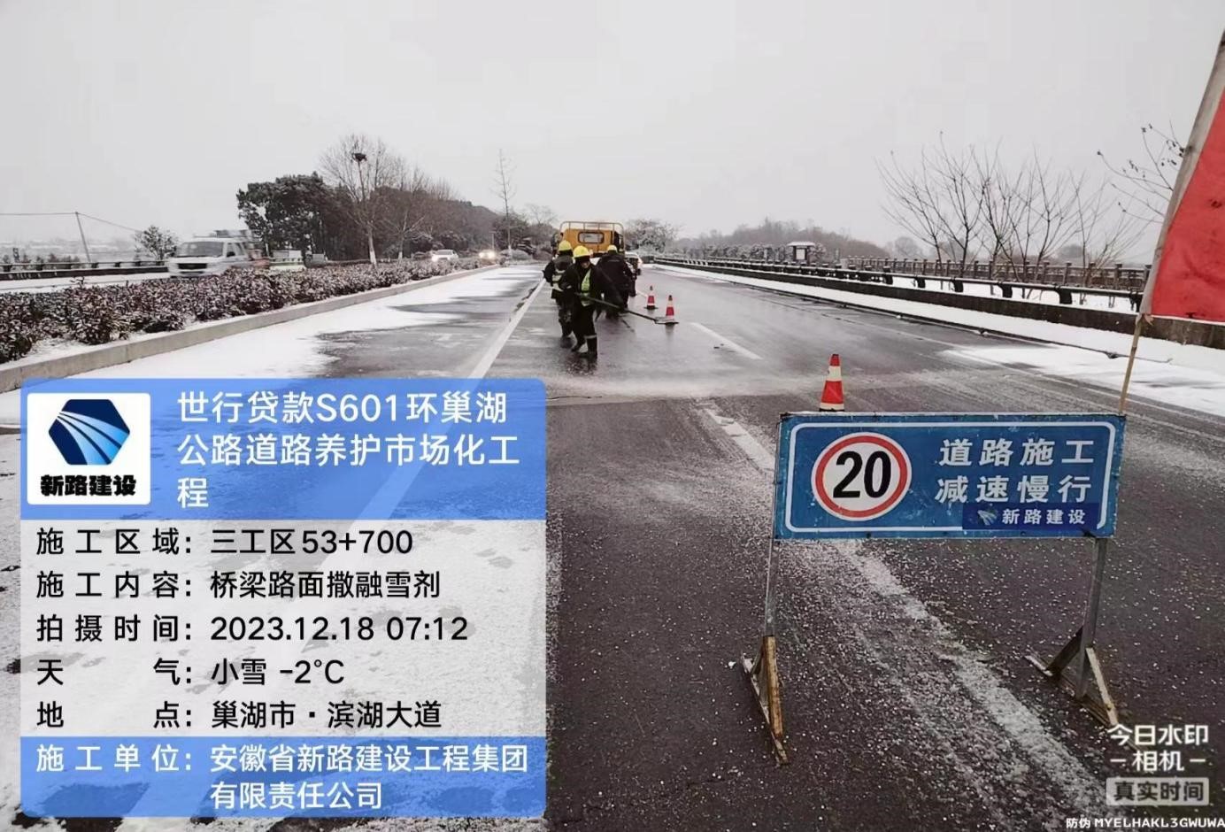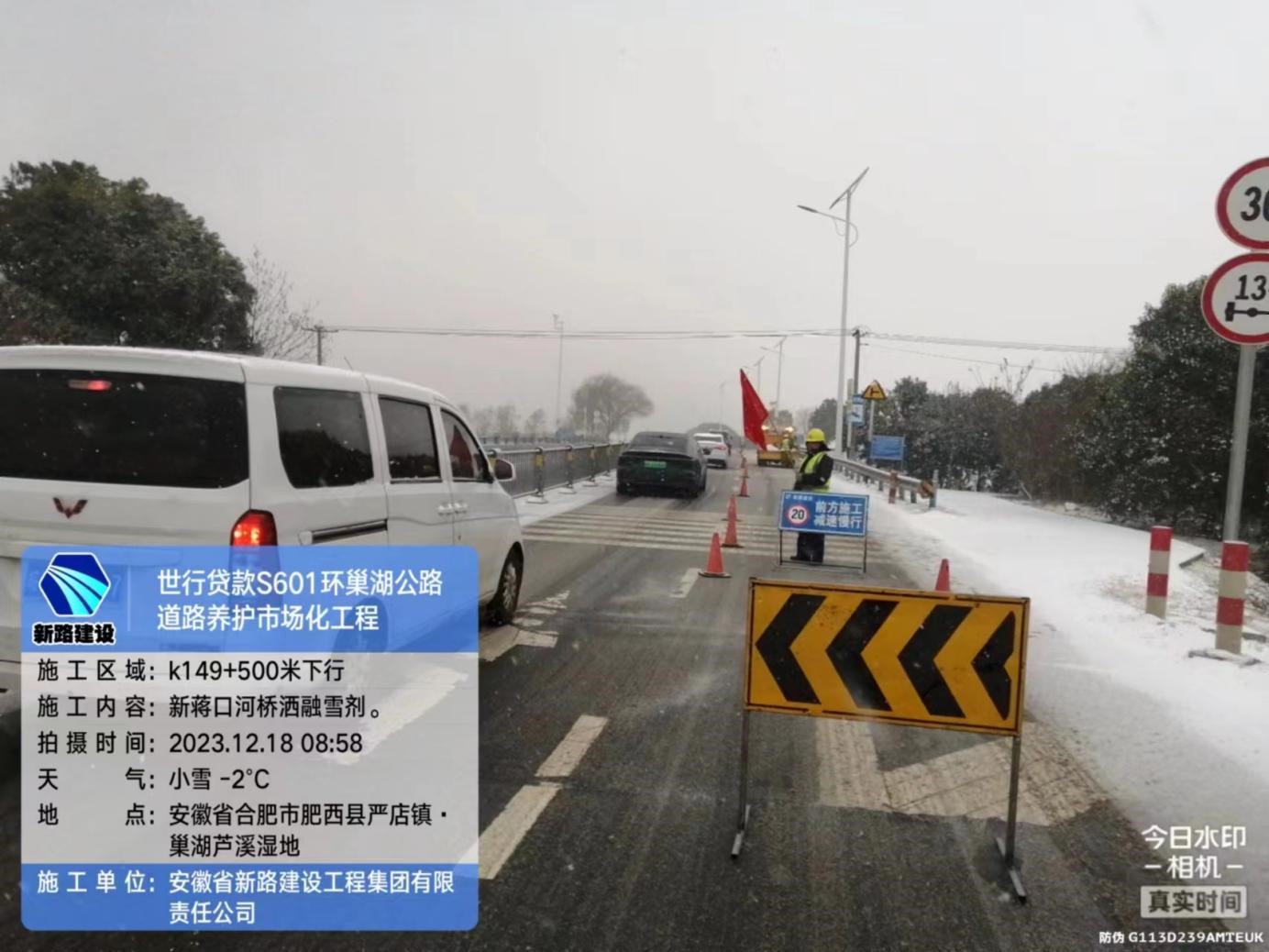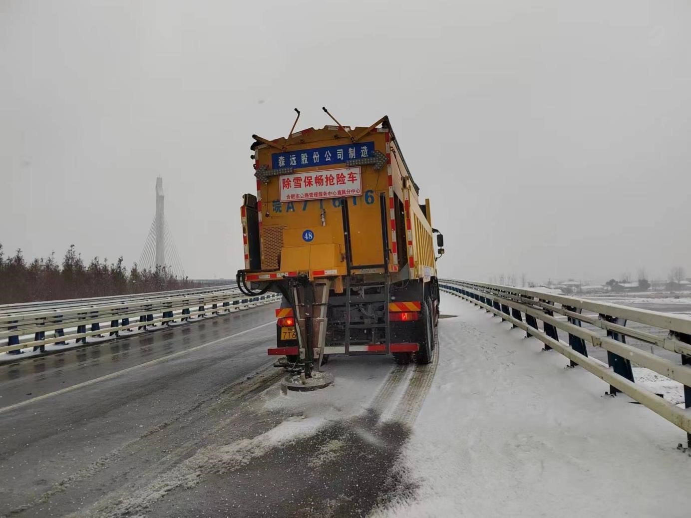 为做到“雪停路通”,项目部按照“边下边清”的工作要求,采取“机械+人工”组合作业方式,重点对沿线32座桥梁、长陡坡、急弯处等积雪结冰路段撒布融雪剂。在肥东肥西重点路段安排专人值守应急点,指挥来往车辆,保障司乘人员雪天通行安全。