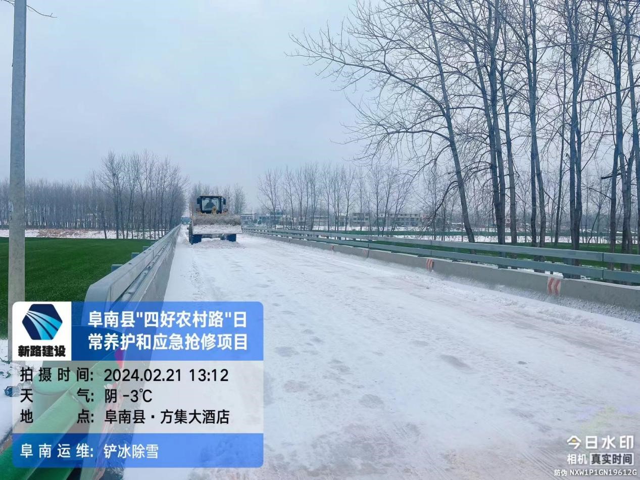 大雪将至,2月20日晚上7点,阜南运维中心人员立即开展夜间道路安全巡查工作,对阜南县各乡镇交通要道及桥梁进行安全通行情况进行巡查,确保车辆及行人通行安全。次日6点,运维中心全体人员准备就绪,四个片区同时开展铲冰除雪工作,积极做好雨雪冰冻恶劣天气应对工作,先后对王家坝蒙洼大桥、方集分洪道大桥、方集洪河大桥等多座桥梁和X543西许路、X555老段路等管养重要路段进行撒布融雪剂、工业盐,清除道路桥梁积雪,保障车辆及行人安全通行。
