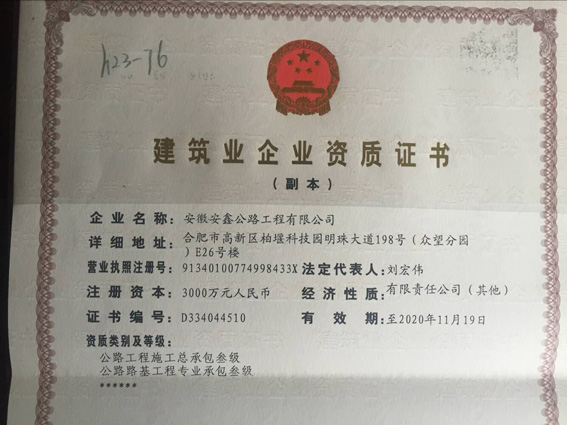 为更好的适应市场发展的需要,在集团领导的关怀、全体员工的辛勤努力下,我公司申请的公路工程施工总承包三级资质于2016年9月21日通过审批,并于9月26日通过公示期进行发放。该资质的获得意味着将扩宽我公司的公路工程市场领域,在集团公司的指导下,我公司将在资质许可范围内积极参与市场投标,并在维护好现有资质的同时为进一步取得其他资质做好充足的准备。