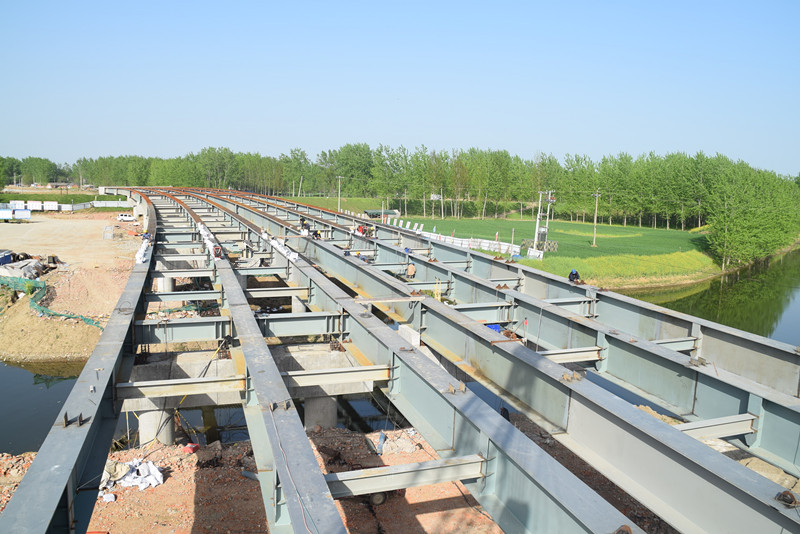 305省道阜阳王店至阜南长安段改建工程02标K16+595陶孜河大桥全长258.1 米,截止2018年4月9日现已完成全桥所有钢板梁架设,标志着我标段唯一一座大桥将进入新的施工阶段,钢板梁的顺利安装为公司积累了宝贵的经验财富,也为下步桥面系及附属工程施工奠定良好基础,确保陶孜河大桥能按照总体施工计划完成。