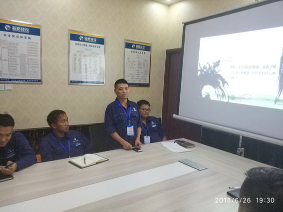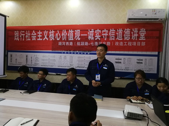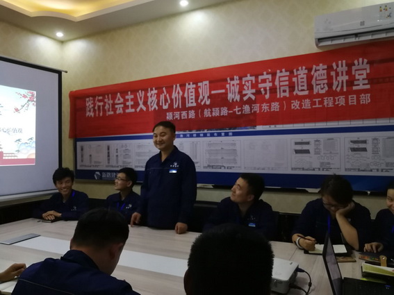为强化项目部全体员工的诚信意识,进一步培养员工们的诚信行为,积极培育和践行社会主义核心价值观,6月26日,颍河西路项目部举办了以“践行社会主义核心价值观—诚实守信”为主题的道德讲堂活动。
