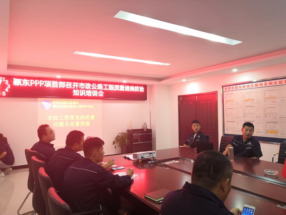 为了提高项目部生产管理水平,深化理论学习,进一步提高员工的安全质量意识和业务水平,颍东PPP项目部于2018年7月19日晚间对项目部相关技术人员及各班组技术人员进行一次《市政工程常见的质量问题及处置措施》培训学习。