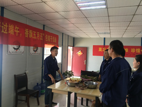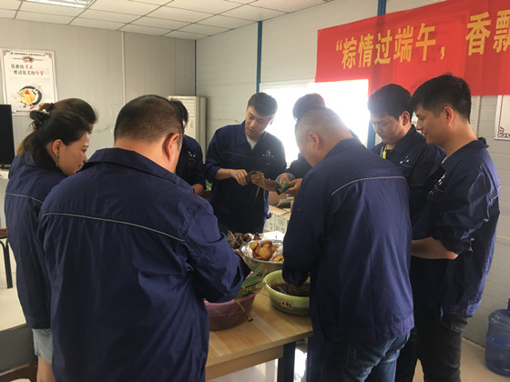 首先经理助理李秦向大家致以节日的问候,感谢大家在佳节到来之际依然坚守在各自的岗位上,也感谢员工家属的支持与谅解,随后,宣布本次包粽子活动正式开始,工地男同志较多,会包粽子的更是寥寥无几,大家互相参考借鉴,经历一次次失败后,终于迎来了一个个并不完美的成品,大家拿着自己的作品,傻傻的笑着,虽然大部分都包的不成样子,但从大家的欢声笑语中还是感受到了大家难以言表的喜悦。