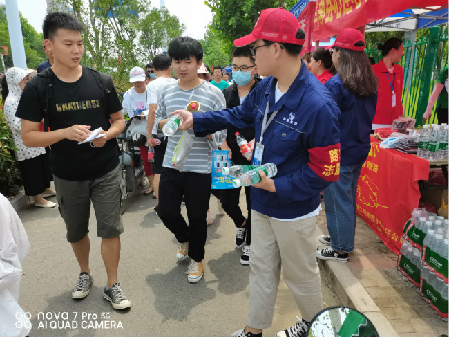 志愿者们为考生发放饮用水