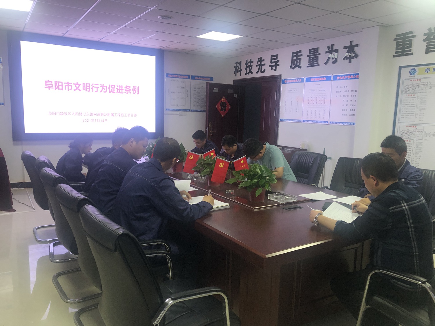 为培育和践行社会主义核心价值观,巩固阜阳首创全国文明城市成果,5月14日,太和路项目部组织全体员工共同学习新颁布的《阜阳市文明行为促进条例》。
