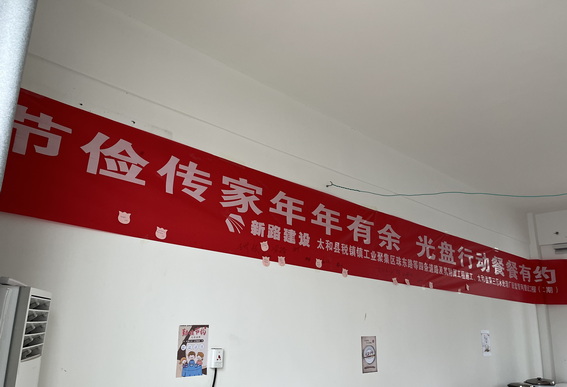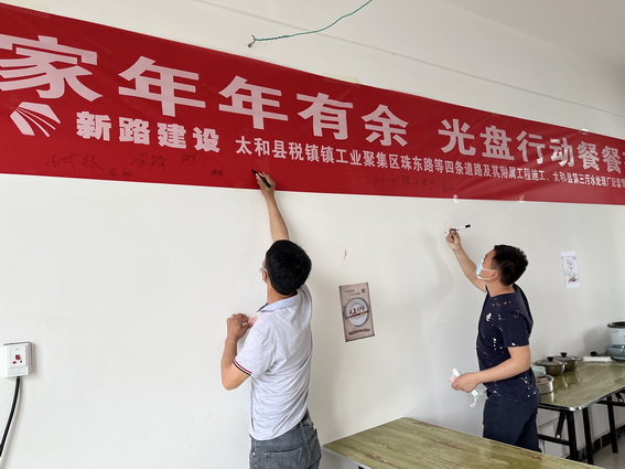 图为:项目全体员工就完餐写下勤俭节约标语