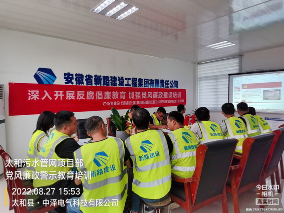 推进全面从严治党纵深发展,深化党风廉政建设和反腐败工作,增强项目全体人员廉洁自律意识,提升全员拒腐防变的思想自觉和行动自觉,8月27日下午,太和税镇及污水管网项目组织全体员工观看专题警示片《零容忍》第二集《打虎拍蝇》。