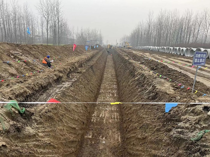 该工程雨水沟槽于2022.12月末开始施工,现已完成桥南段200m雨水沟槽开挖及管道安装,预计2023年3月完成雨污水施工,2023年6月完成全段道路及附属物施工。