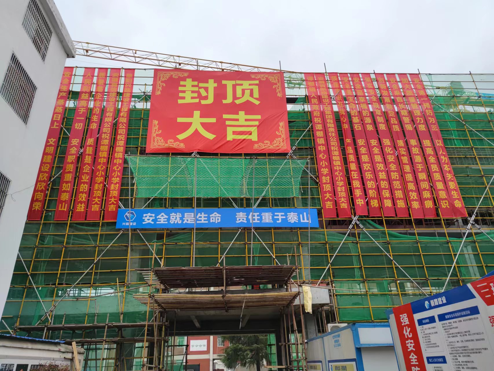 2023年2月12日,临泉县2022年义务教育学校校舍维修改造及陶老乡南湾安居工程基础设施配套项目道路及排水工程项目谭鹏中心小学教学楼完成最后一方混凝土浇筑,主体结构均封顶,谭棚镇中心小学新建工程,谭棚镇中心小学建筑面积 4260.7m2,地上四层,结构类型框架结构,楼盖结构现浇钢筋混凝土梁板结构,基础类型独立基础,包含室内装饰(砌筑工程、门窗工程、楼地面装饰工程、天棚工程、油漆、涂料、裱糊工程,其他装饰工程等),水电安装(强电工程,应急照明工程,给排水工程等),室外配套等工程。