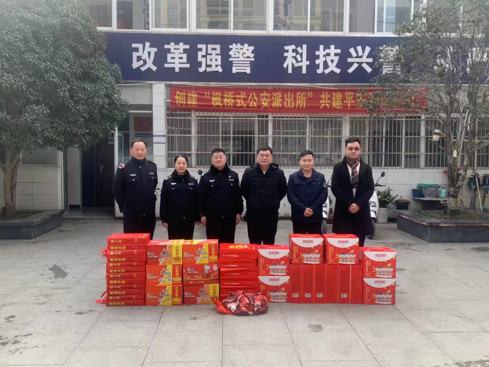 2024年1月26日,杨圩社区王武军书记携PA视讯集团颍上城南路网项目部到颍河派出所开展慰问,并带着王老吉、香飘飘等作为新年佳礼,为颍河派出所民辅警送去了新年的关怀。