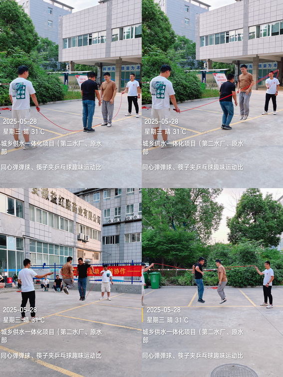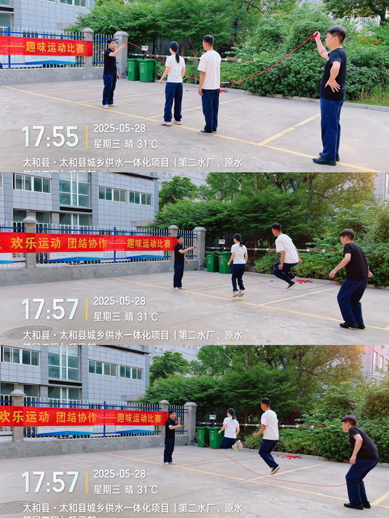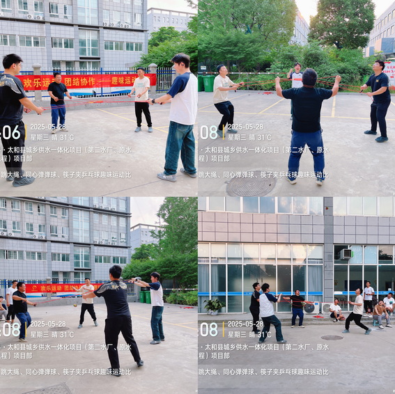 为丰富职工业余文化生活,营造积极向上、团结协作的工作氛围,进一步增强项目团队的凝聚力和向心力,5月28日下午,太和供水一体化项目精心组织了一场别开生面的职工趣味运动比赛。活动现场气氛热烈,欢声笑语不断,“跳大绳”、“同心弹弹球”、“筷子夹乒乓球”三项趣味赛事轮番上演,充分展现了太和供水一体化项目全体成员的活力与风采。