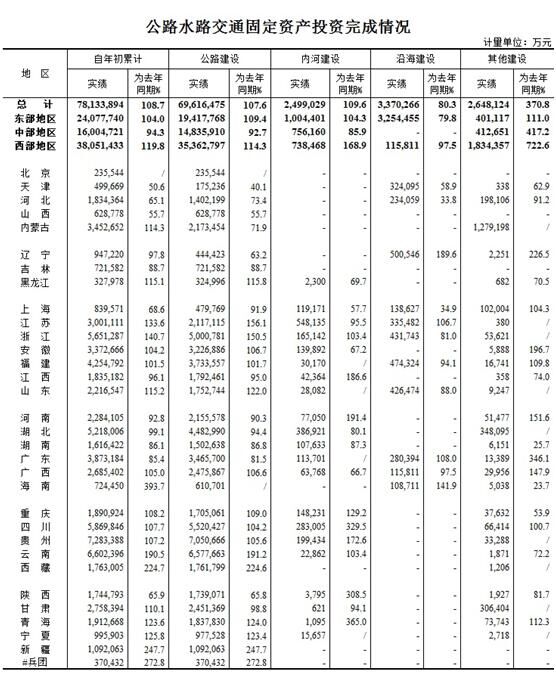 年1-6月公路水路交通固定资产投资完成情况