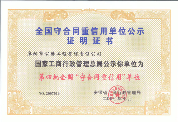 由国家工商总局举办的第四届“守合同重信用先进单位”评选活动近日揭晓,阜阳市公路工程有限公司凭借在公路建设领域的突出成绩及良好的社会信用入选成为第四届“守合同重信用先进单位”,并受到表彰。此次评选旨在表彰我公司在市场交易中,坚持“守约重信”的经营道德,弘扬先进的企业合同管理方式,倡导诚信理念,服务经济建设,提升企业信用等级。