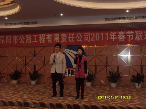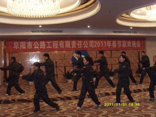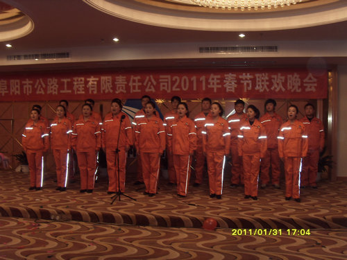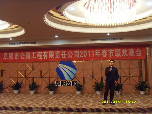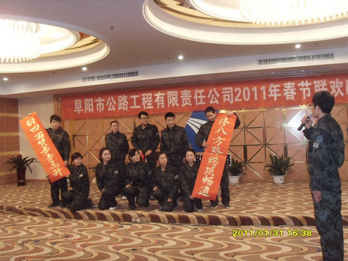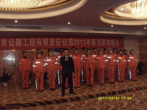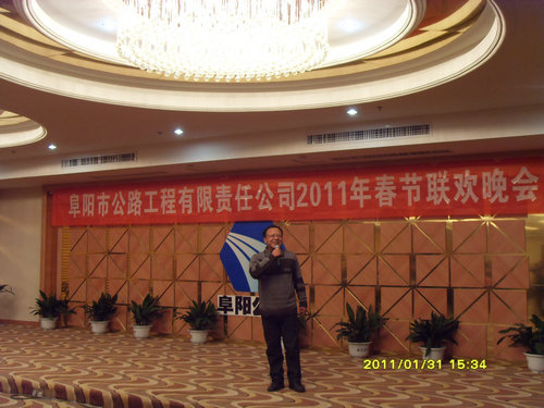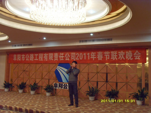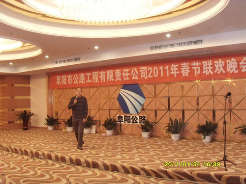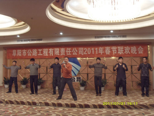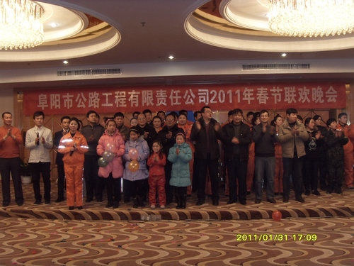 虎振雄风留浩气,兔迎盛世启新程。2011年1月31日,阜阳市公路工程有限责任公司迎新春联欢晚会在一片欢声笑语的海洋中拉开序幕。公司领导与员工欢聚一堂,共迎新春的到来。每个人脸上都挂满笑容,到处都洋溢着喜庆的气氛,一声声祝福和问候将现场气氛烘托得喜气洋洋。