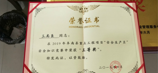 以“防风险、除隐患、遏事故”为主题,倡导绿色安康可持续发展理念; 6月5日,阜南县重点工程建设管理服务中心组织举办的2019年阜南县重点工程项目“安全生产月”安全知识竞赛在S238项目部落下帷幕。阜南PPP项目部员工代表王忠臣表现优异,喜获三等奖。