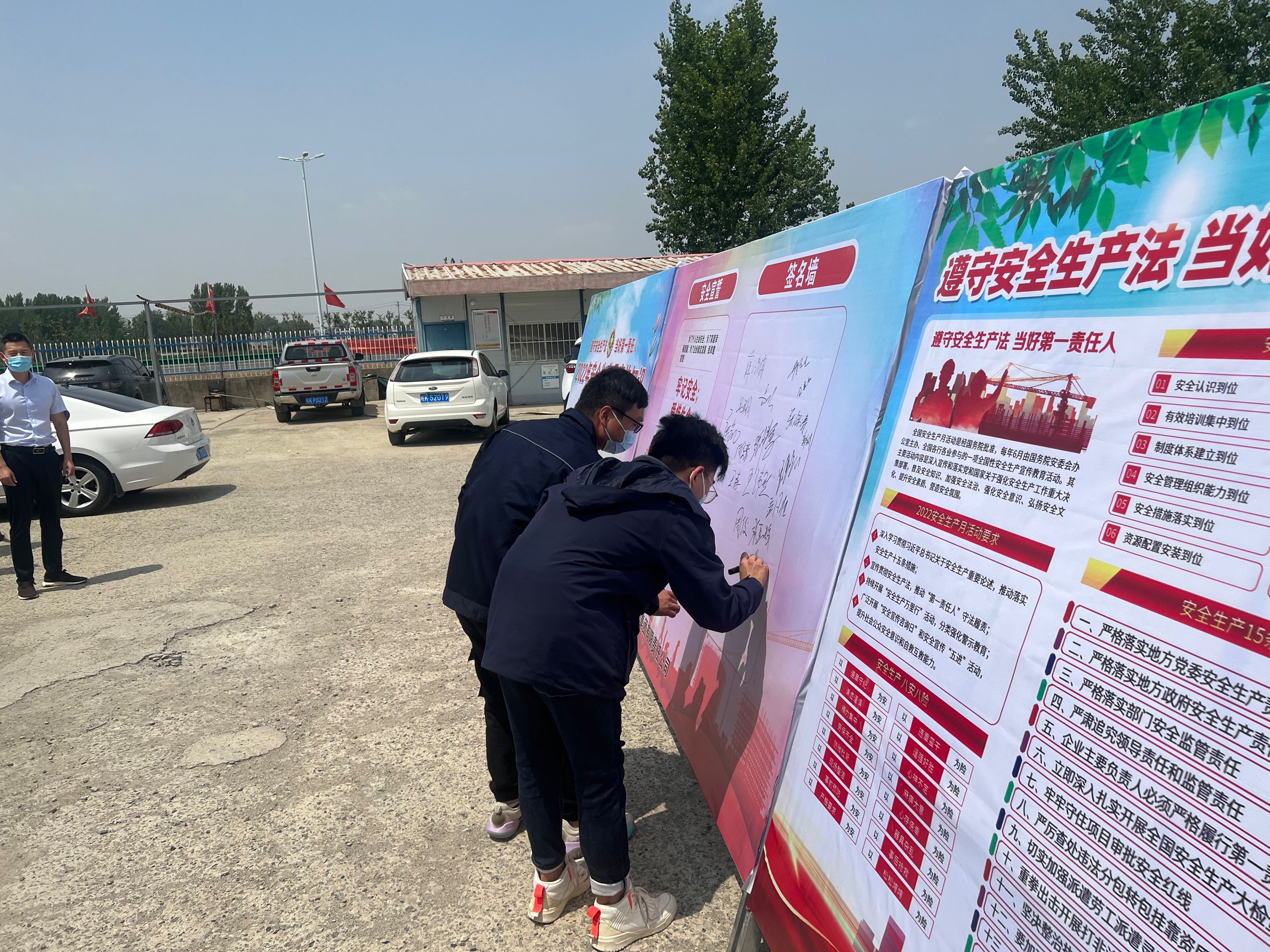 二、安全宣誓活动:启动仪式结束后,项目部全体人员在项目院内开展“安全生产月”宣誓活动。项目经理薛鸿儒领誓,项目全体人员高举右手,庄严宣誓。