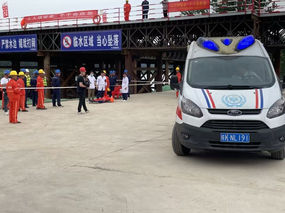 S428(原S420)颍上杨湖至赛涧颍河大桥及接线工程项目部于2023年6月16日下午15:00时,在南岸钢栈桥施工现场组织开展了“防溺水事故应急处置演练”,项目部管理人员、监理人员及颍上县海事(港航)管理服务中心联合一线作业人员共同参加演练。邀请市交通执法支队、颍上县水利局、颍上淮河河道管理局、刘集乡人民政府、赛涧回族乡人民政府进行观摩,颍上县应急管理局、颍上县交通局和颍上交投能源投资建设集团有限公司等领导对本次防溺水事故应急处置演练进行了高度评价。