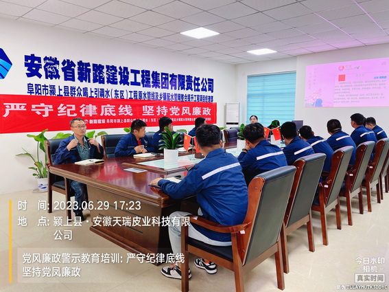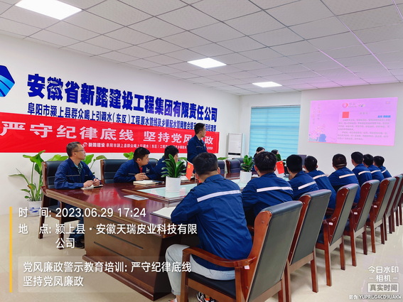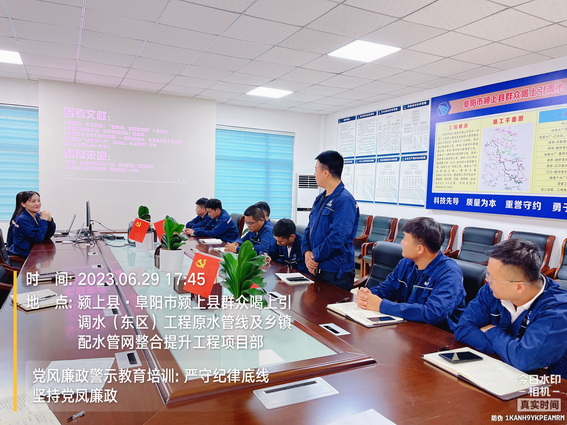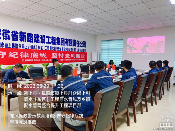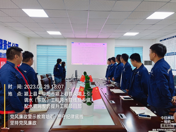 为进一步学习廉政文化、中国共产党廉洁自律准则、中国共产党纪律处分条例,增强项目员工廉洁自律意识,深化党风廉政建设和反腐败工作,6月29日下午,颍上管网东区项目在会议室组织全体员工开展了党风廉政专题教育培训。