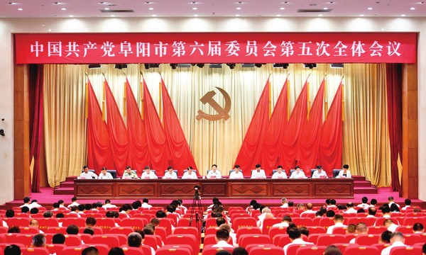 中国共产党阜阳市第六届委员会第五次全体会议于8月28日举行。出席这次全会的有,市委委员51人,市委候补委员9人。全会由市委常委会主持。市委书记刘玉杰讲话。市委副书记、市长胡明文出席,省委第四巡视组副组长王刚应邀到会指导。市人大常委会主任胡明莹,市政协主席李志伟,市委副书记李军,市委常委章绍伟、王波、陈兆国、白晓云、吕国平、张俊杰、邵兵参加。